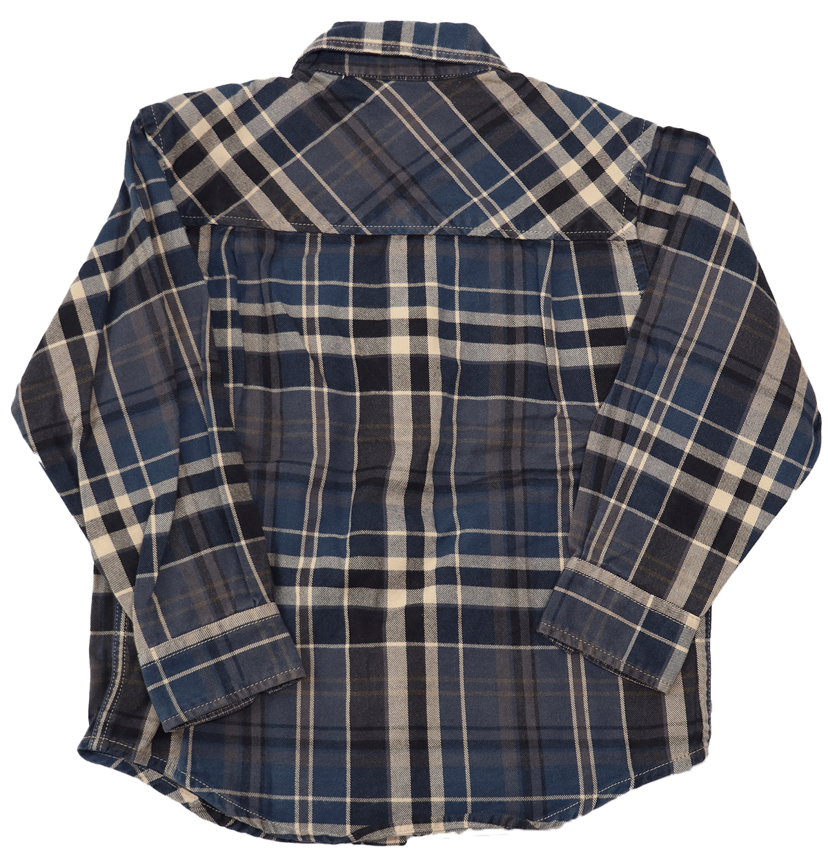 De hals is voorzien van een soepele kraag die zacht aanvoelt en mooi in model blijft. Dit model heeft lange mouwen en is voorzien van sluitknoopjes voor een praktische pasvorm. Aan de voorzijde heeft het overhemd donkerblauw-grijze plastic sluitknopen, waarbij het onderste knoopje een beige kleur heeft. Dit geeft een speels en uniek detail aan het ontwerp.