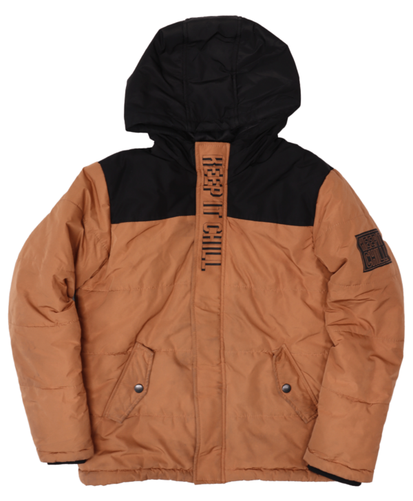 De jas is praktisch in gebruik, met een doorlopende ritssluiting en klittenband voor extra sluiting. De twee steekzakken aan de voorzijde zijn afsluitbaar met drukknopen, zodat waardevolle spullen veilig opgeborgen kunnen worden. De kleur van de jas is bruin met zwarte details, wat een stoere en tijdloze uitstraling geeft. Op de voorzijde is de tekst ‘Keep it chill’ gedrukt, wat een leuke toevoeging is voor een moderne uitstraling.