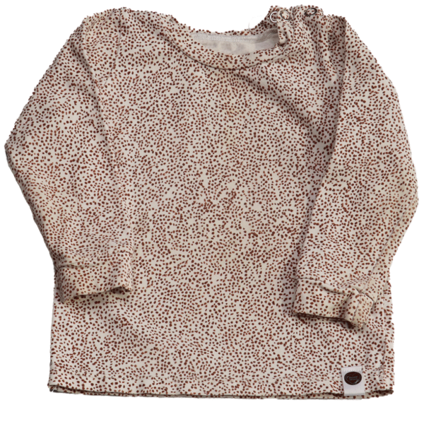 Deze prachtige longsleeve, handgemaakt en voorzien van een label van Huisje Prior, is een uniek stuk dat een aanvulling is op elke garderobe. Het shirt is gemaakt van stevig katoen met elastaan, wat zorgt voor een comfortabele pasvorm en duurzaamheid. De witte kleur van het shirt, versierd met een motief van kleine bruine vlekjes, geeft het een frisse en moderne uitstraling.