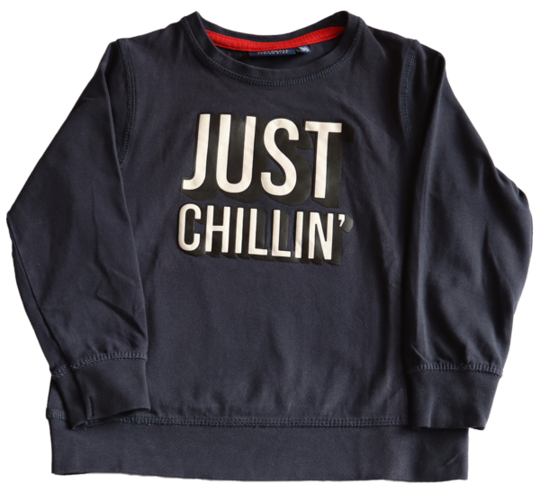 De trui heeft een mooie donkerblauwe kleur, die makkelijk te combineren is met andere kledingstukken. Op de voorkant staat de stoere tekst “Just chillin'” in zwart-wit, wat de trui een coole uitstraling geeft. De tekst is gedetailleerd en goed zichtbaar, zonder vervaging of beschadigingen. Het ontwerp van de trui is eenvoudig maar stijlvol, waardoor het een veelzijdig kledingstuk is voor elke casual gelegenheid.