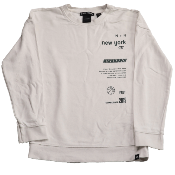 De sweater heeft een strak wit design dat wordt geaccentueerd door verschillende tekstafdrukken op de voorkant in een contrasterende zwarte kleur. Deze opdrukken geven de sweater een unieke en trendy uitstraling, waardoor het een opvallend stuk is dat zeker de aandacht zal trekken.