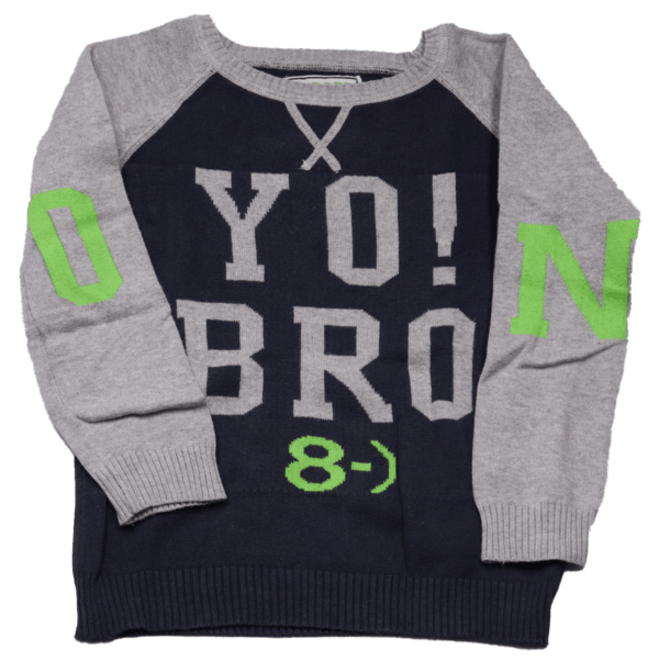De trui heeft een licht grijze basis met donkerblauwe details, wat zorgt voor een frisse en moderne uitstraling. Op de voorzijde staat de tekst “Yo! bro” in grote letters, vergezeld van een smiley. Deze vrolijke en speelse tekst geeft de trui een jeugdige en casual look, die perfect past bij de actieve levensstijl van jonge jongens. De opvallende opdruk maakt de trui extra leuk en geeft het een unieke uitstraling.