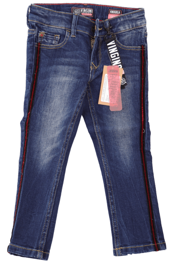 Stijlvolle Vingino meisjesjeans Amadea in maat 92. Skinny fit, 5-pocket, donkerblauw met velours bies en verstelbare tailleband. Nieuw met labels.