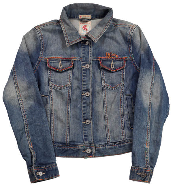 Een opvallend kenmerk van deze jeans jas zijn de oranje details op de flappen van de borstzakjes. Dit geeft de jas een trendy en unieke uitstraling. De jas heeft een iets donkere kleur met een washing look, wat bijdraagt aan de stoere uitstraling van de jas.