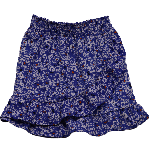 De donkerblauwe kleur van het rokje is versierd met een all-over motief van witte bloemen, wat een frisse en charmante uitstraling geeft. Aan de voorkant en onderaan de boord is de rok voorzien van een extra ruche. Deze speelse details voegen flair toe en maken het rokje extra bijzonder.