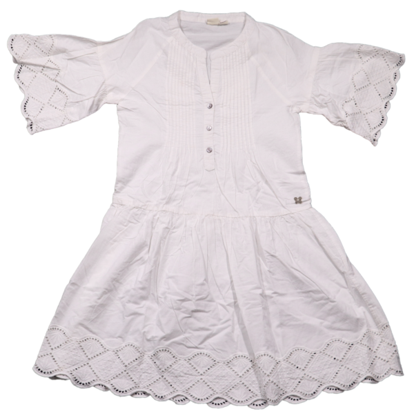 De ronde halslijn van de jurk is een klassiek detail, maar het wordt extra speels door de drie sluitknopen die lager zijn geplaatst. Deze knopen creëren een subtiele V-hals, wat de jurk een modieuze uitstraling geeft. De mouwen en de rok zijn prachtig afgewerkt met sierlijk kant, wat de jurk een verfijnde, vrouwelijke touch geeft. Aan de voorzijde van de top zijn mooie, gestikte plooien aangebracht, die tevens extra flair en een leuke structuur aan de jurk geven.