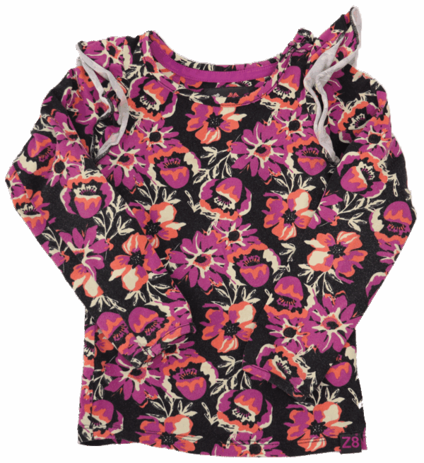 Z8 Bibelotte longsleeve maat 92-98. Zwart met roze-oranje bloemen en ruches. Comfortabel katoen met elastaan. Netjes gedragen. De zwarte kleur is wat faal. Enkele lichte gebruikerssporen.