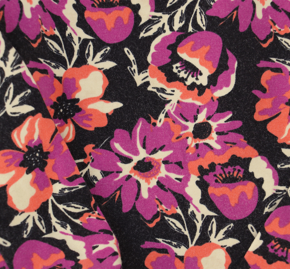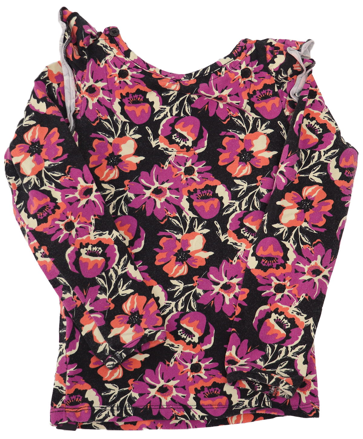 De basis van het shirt is zwart. Het is versierd met een opvallend motief van grote bloemen in roze en oranje kleuren. Dit zorgt voor een vrolijke en kleurrijke uitstraling. De schoudernaden zijn extra versierd met een dubbele sierlijke ruche. Dit detail maakt de longsleeve extra speciaal en meisjesachtig.