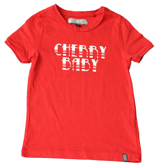 Cars Jeans t-shirt maat 104 in de kleur rood. Op de voorkant staat de tekst Cherry Baby.