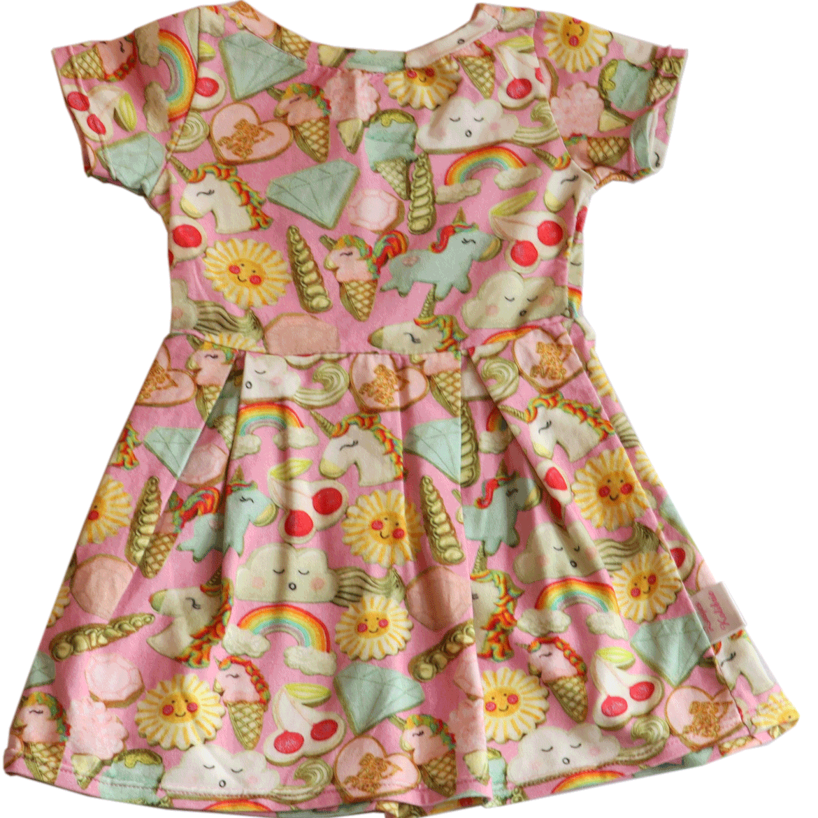 Zusjes Kolibrie jurk. Vrolijk zomers jurkje met vele figuren waaronder unicorns en regenbogen. Roze, maat 80. Nieuw met kaartje. Bestel nu!