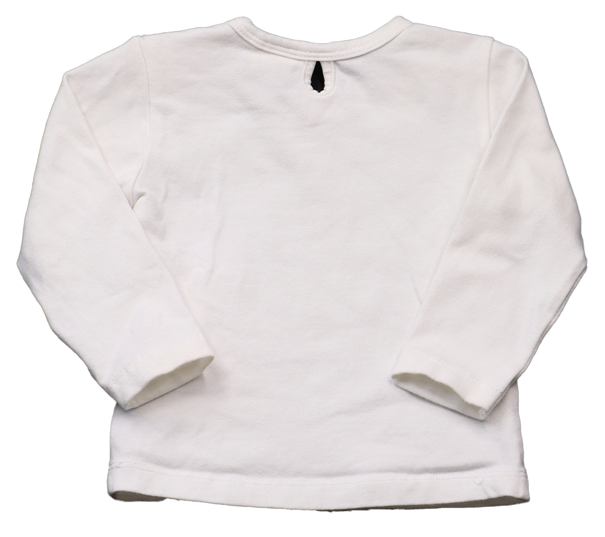 Aan de linker schouder zijn twee witte drukknoopjes geplaatst. Deze maken het aan- en uittrekken een stuk eenvoudiger. De schoudernaden zijn versierd met een subtiele, kleine ruche. Dit geeft de longsleeve een extra schattig detail. Het shirt heeft een frisse witte kleur, perfect voor elke gelegenheid.
