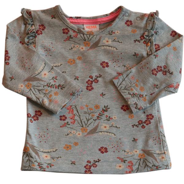 Deze Hema blauwe bloemetje longsleeve heeft een zachte blauwe kleur die rust en kalmte uitstraalt. Het is versierd met verschillende soorten bloemen in diverse kleuren, wat een vrolijke en speelse uitstraling geeft. Deze bloemenprint maakt het shirtje perfect voor zowel dagelijkse activiteiten als speciale gelegenheden.
