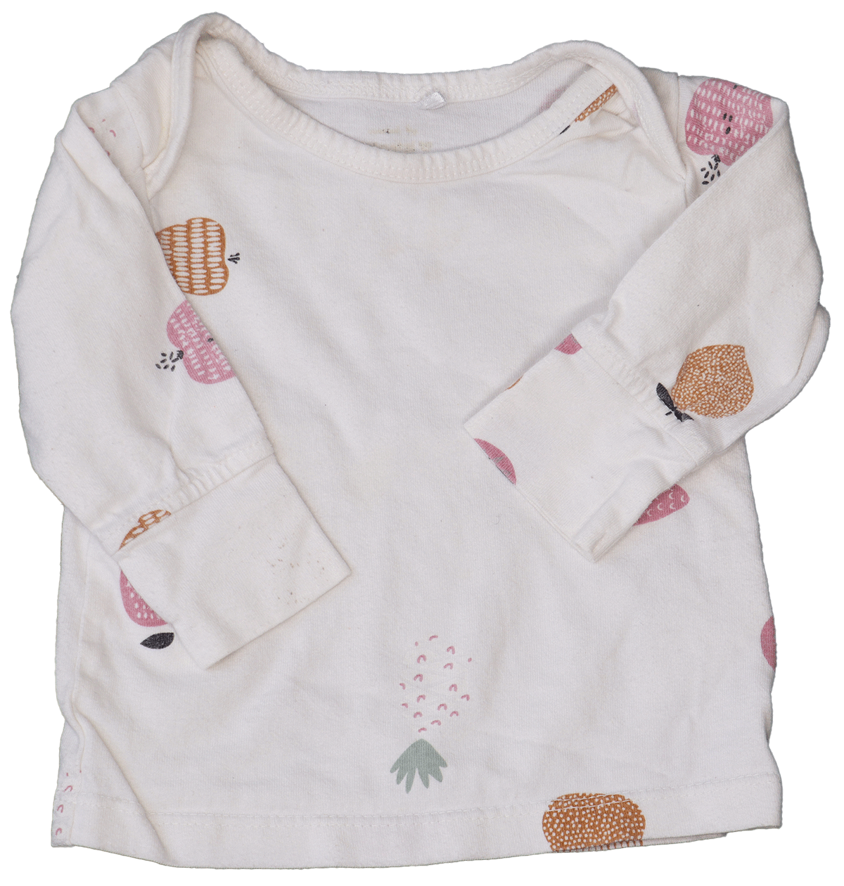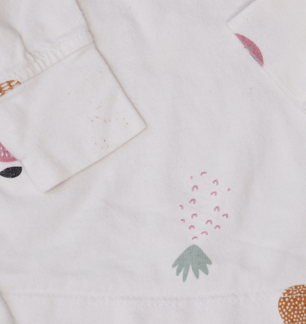 Het Prénatal fruit pyjama setje is tweedehands en vertoont gebruikssporen. Er zijn enkele kleine vlekjes zichtbaar. Er zitten echter geen gaten in de stof. Het materiaal voelt nog prettig aan en de kleuren zijn netjes gebleven.