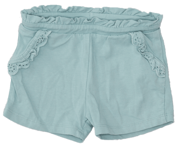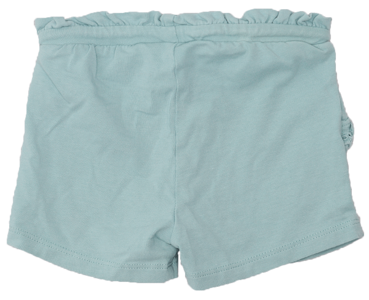 Name It short maat 62 voor babymeisjes. Lichtblauw, biologisch katoen met ruches. Tweedehands, goed onderhouden en vrij van vlekken of gaten.