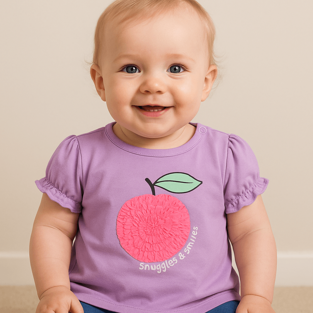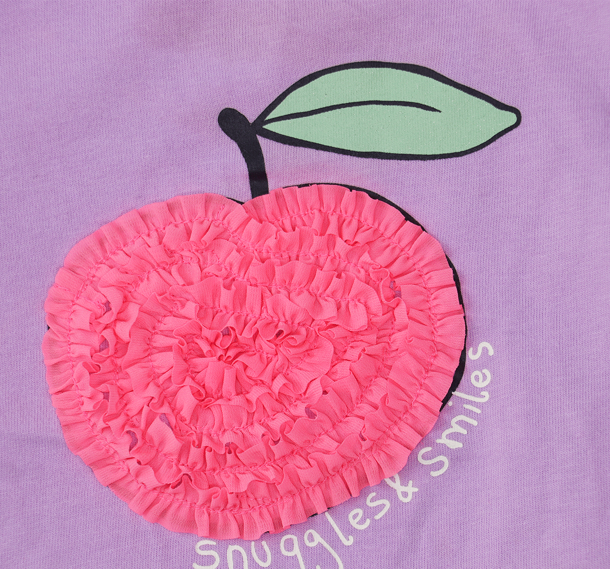 De eyecatcher van dit shirt is de afbeelding op de voorkant van een grote roze appel. De appel is gemaakt van een opvallende stof met ruches, wat zorgt voor een extra textuureffect. Het steeltje en het groene blad zijn in de stof gedrukt en geven het ontwerp een vrolijke finishing touch. Onder de afbeelding staat de tekst “snuggles & smiles”, wat perfect past bij het karakter van het shirt.