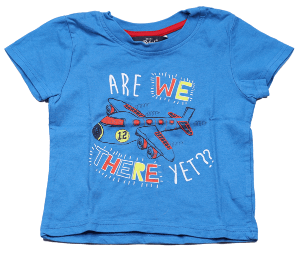 Op de voorzijde van het T-shirt staat een opvallende afbeelding van een vliegtuig. De afbeelding wordt aangevuld met de tekst: “Are we there yet??”. Deze tekst en afbeelding zijn versierd met rode en gele details, wat het shirt een speelse en avontuurlijke uitstraling geeft.
