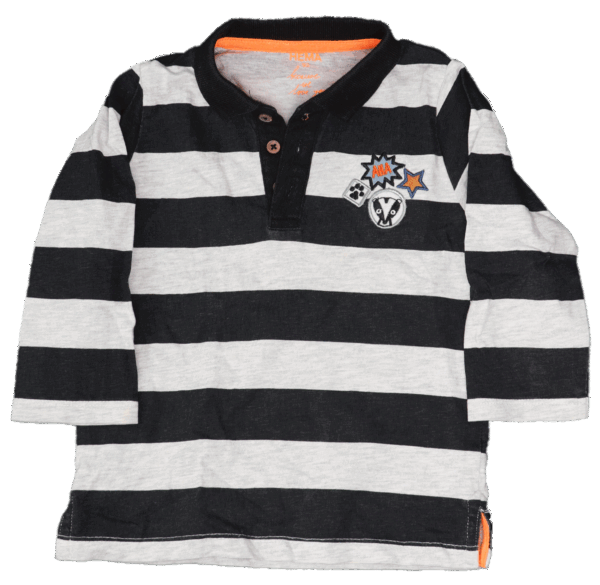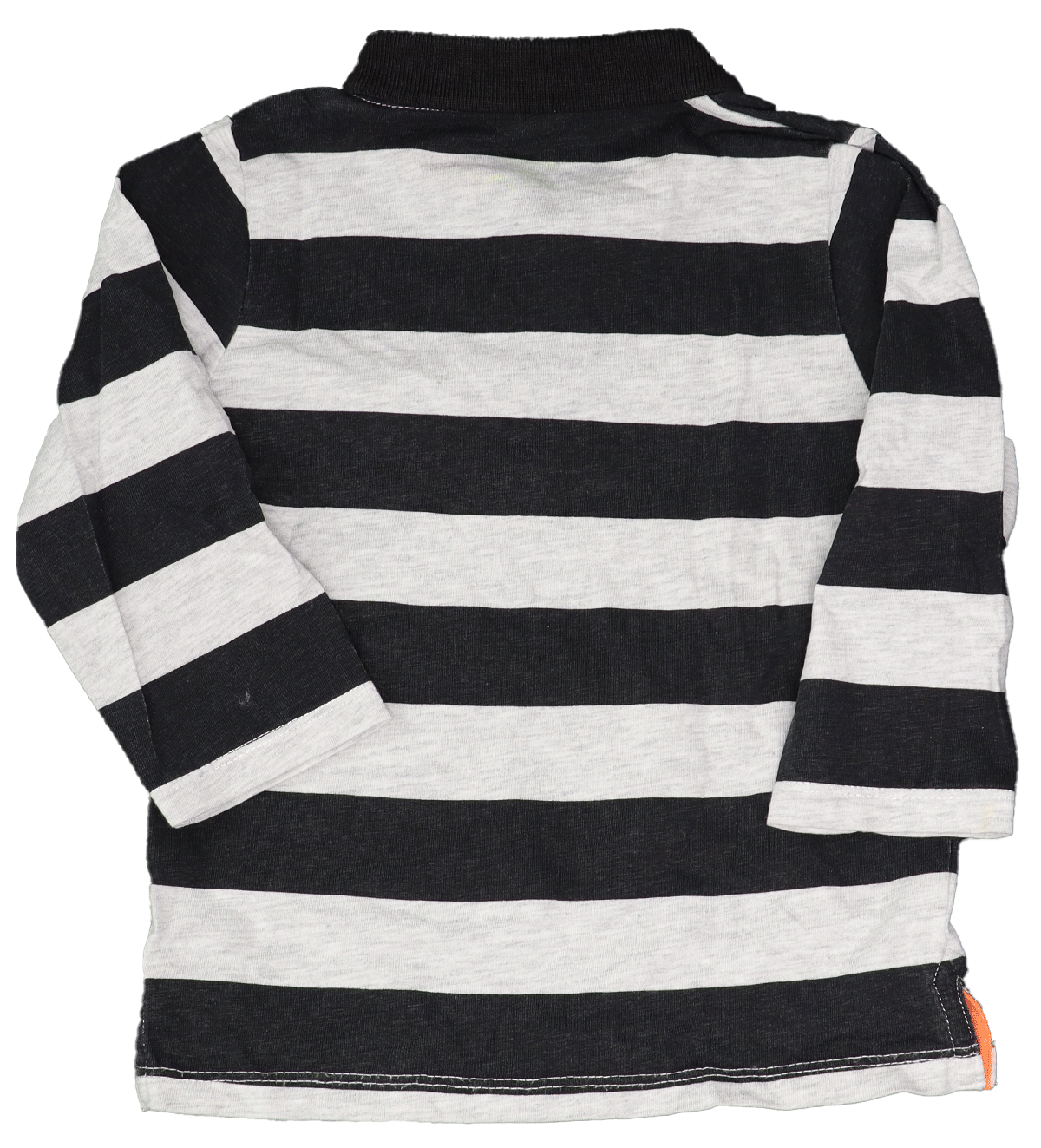 Stijlvolle HEMA polo longsleeve in maat 92. Zwart-grijs gestreept, met ribkraag en knoopjes. Gemaakt van katoen-viscose. Goede staat.