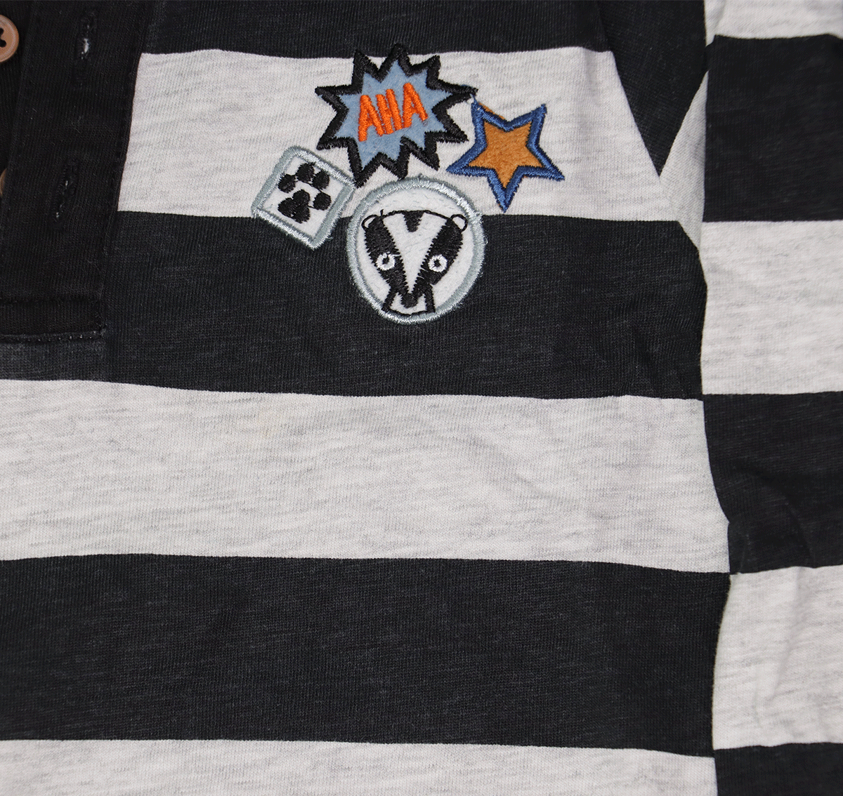 Aan beide zijkanten zit een klein splitje in de zijnaden. Dit geeft extra bewegingsruimte en een speels detail. De onderzijde en mouwuiteinden zijn netjes afgewerkt met een basic boord. Op de linkerborst zijn kleine applicaties geborduurd. Deze zorgen voor een subtiel en verzorgd accent.