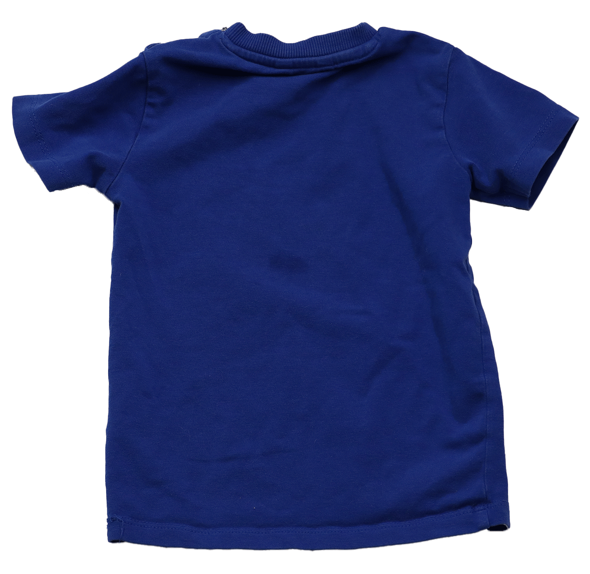 Op de rugzijde zitten twee donkerblauwe vlekjes, wat het unieke karakter van het shirt benadrukt. De gebarsten opdruk voegt een speels en vintage gevoel toe aan het kledingstuk. Dit T-shirt is ideaal voor ouders die op zoek zijn naar een stijlvol, comfortabel en duurzaam shirt voor hun kleintje.