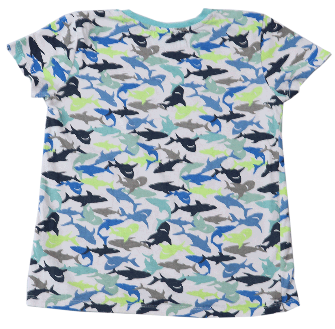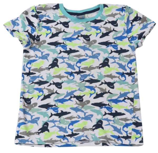 Wat dit T-shirt echt uniek maakt, is het haaienmotief dat over het hele shirt is verspreid. De haaien zijn afgebeeld in verschillende tinten blauw en grijs, wat een speels en dynamisch effect geeft. Dit ontwerp zal zeker de aandacht trekken van hun vriendjes en zal uw kind het middelpunt van de aandacht maken.
