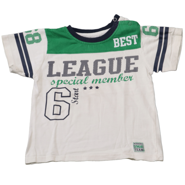 Dit  League T-shirt groen in maat 86 voor jongens is een uitstekende keuze voor dagelijks gebruik. Het shirt heeft een regular fit en een recht model, wat zorgt voor een comfortabele pasvorm. De ronde hals is voorzien van een donkerblauwe boord, wat een mooi contrast geeft met de witte kleur van het shirt.