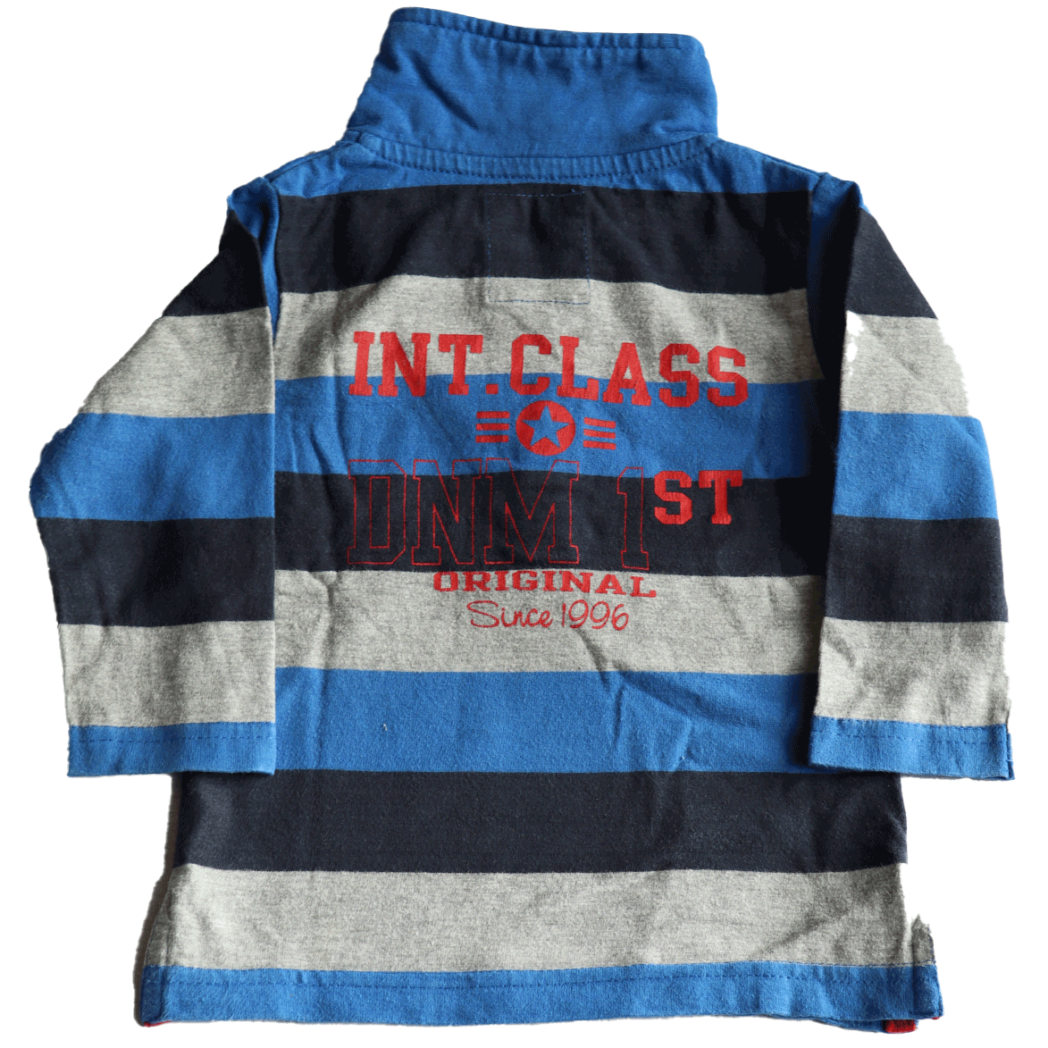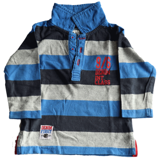 Nette polo met langmouwen in de kleur grijs, rood en verschillende kleuren blauw. De polo draagt de maat 74.