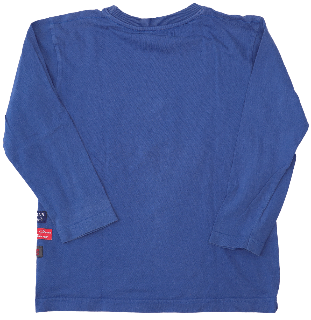 Deze donkerblauwe longsleeve van Ministars in maat 128-134 heeft een regular fit, ronde hals met ribboord en een witte-oranje tekstopdruk met used look. Gemaakt van 100% katoen. Het shirt is gedragen maar in goede staat, zonder gaten, vlekken of pillende stof. Een comfortabele en stoere keuze voor elke dag.