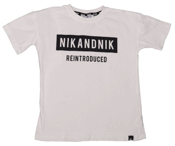 Wit T-shirt van Nik&Nik voor jongens in maat 104. Gemaakt van 100% katoen met een zwart-witte tekstopdruk. Regular fit met basic afwerking. Het shirt is gedragen en heeft een klein gaatje onderaan, maar verder geen opvallende vlekken. De kleur is fris en de print is intact.