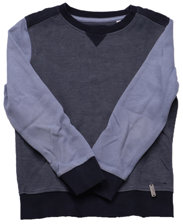 De boorden van de trui zijn donkerblauw, wat een mooi contrast vormt met de lichtblauwe mouwen. Het lijf van de trui heeft een mooie grijze kleur, die goed te combineren is met verschillende outfits. De trui is gemaakt van een mix van katoen en polyester, wat zorgt voor een zachte en comfortabele stof die ook duurzaam is. Deze samenstelling maakt de trui ademend en geschikt voor het hele jaar door.