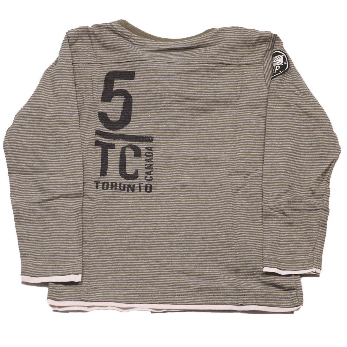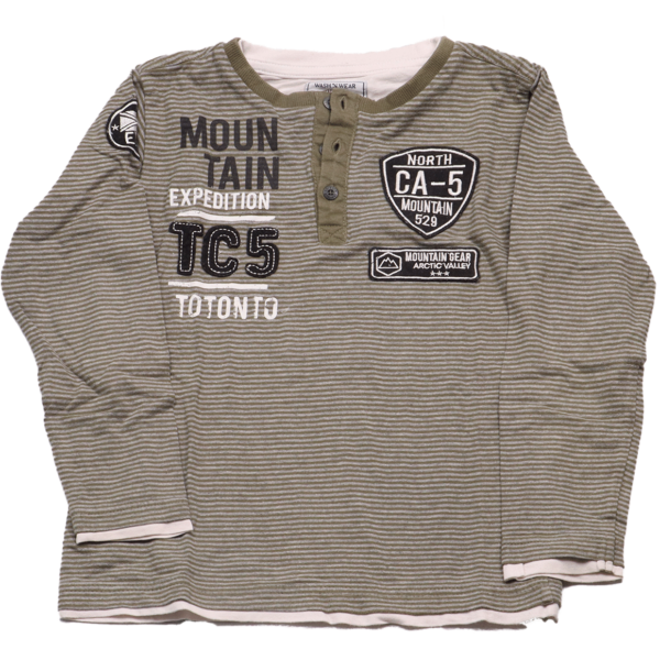De longsleeve is uitgevoerd in een aantrekkelijk horizontaal streepjesmotief, met afwisselende groene en grijze kleuren die gemakkelijk te combineren zijn met andere kledingstukken. De groene boord rond de hals voegt een speels accent toe en de knoopsluiting zorgt voor gemak bij het aan- en uittrekken.