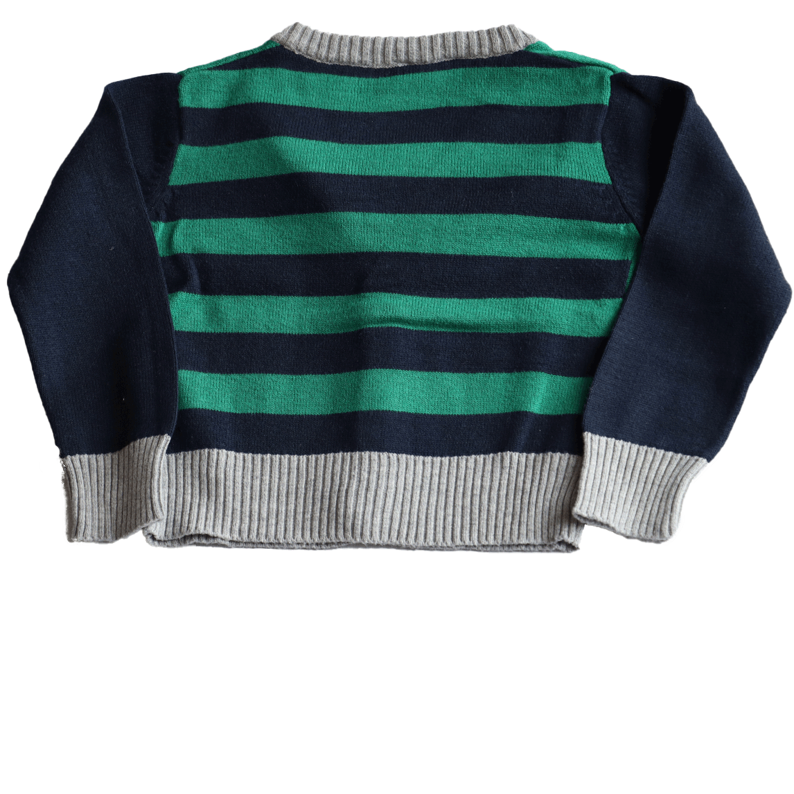 Dit vest happy in maat 86 voor jongens heeft een regular fit pasvorm en een rechte afwerking. De hals heeft een lichtgrijze boord met een V-vorm door de lage uitsnede van de knoopsluiting. Op de voorzijde staat de witte tekst ‘H is for HAPPY’. Het vest is donker groen met donkerblauwe mouwen. De achterzijde heeft een horizontaal strepenmotief in groen en blauw. De knopen zijn van plastic en hebben dezelfde lichtgrijze kleur als de boord. Het vest is gemaakt van 100% katoen. Het is gedragen en heeft enkele gebruikerssporen, maar er zijn geen vlekken of gaten. De stof is niet pillig.