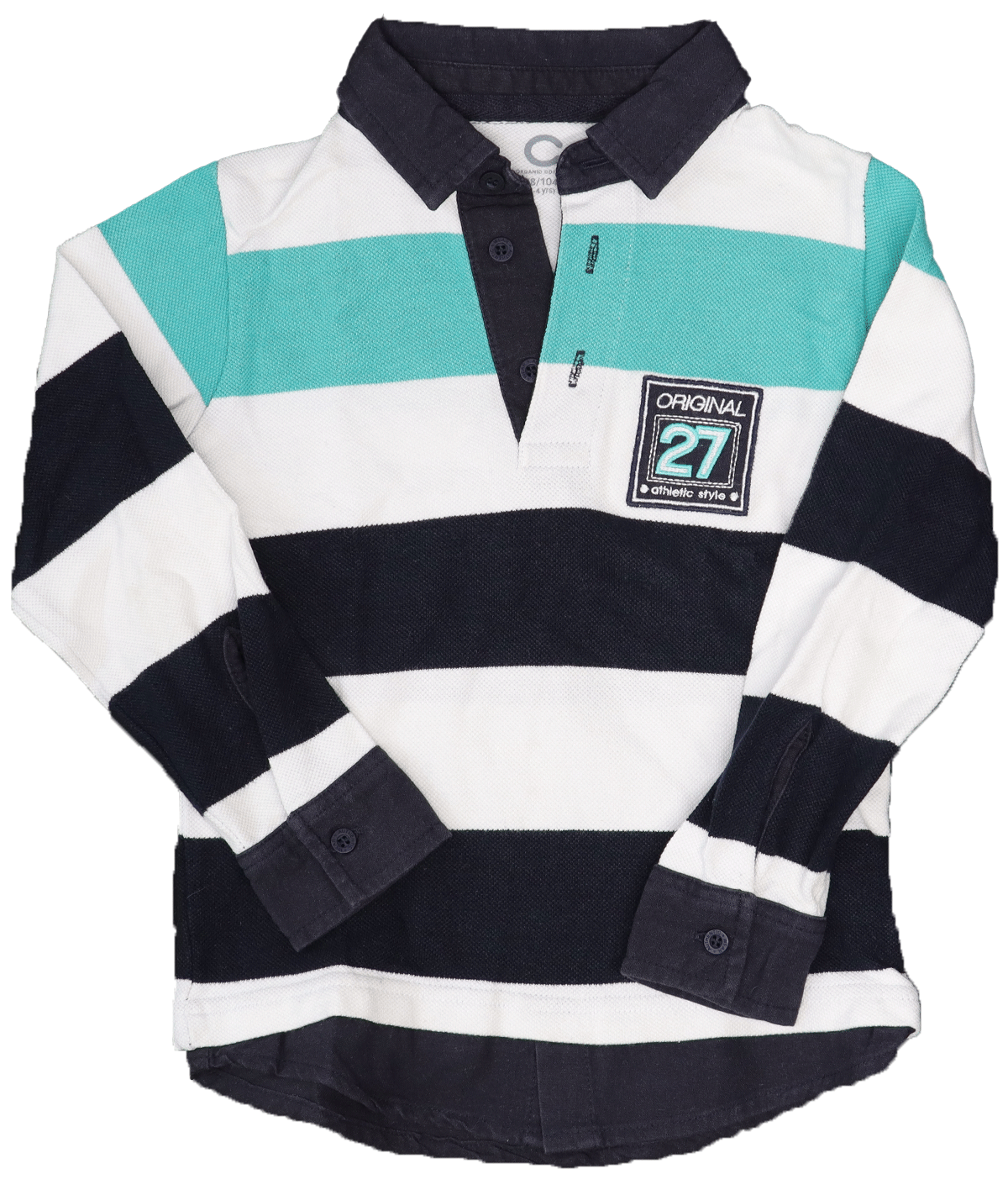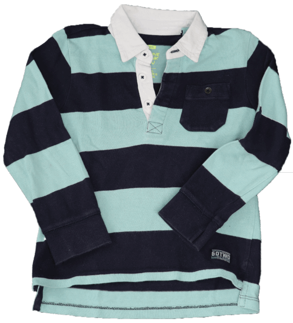 WE longsleeve polo voor jongens in maat 98-104. Licht- en donkerblauwe strepen, wit kraagje, borstzakje en zachte katoenen stof.
