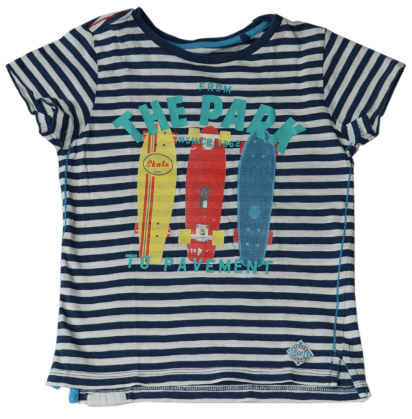 Maak kennis met het WE t-shirt ‘Skateboard’, een trendy toevoeging aan elke kindergarderobe. Dit leuke t-shirt, gemaakt van puur katoen, biedt optimaal comfort en is perfect voor actieve kinderen. Het blauw-witte streepjesmotief zorgt voor een klassieke look met een moderne twist. Op de voorzijde prijkt een levendige afbeelding van gekleurde skateboards, vergezeld door de tekst ‘The Park’. Dit design spreekt tot de verbeelding van elk kind dat van skaten houdt.