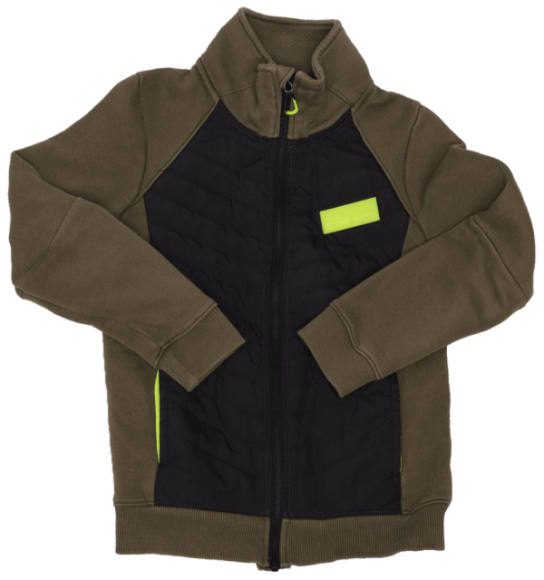Stoer WE vest voor jongens maat 134-140. Groen met zwarte voorkant, neon accenten, lichte pil, rits werkt. Geen gaten of vlekken.