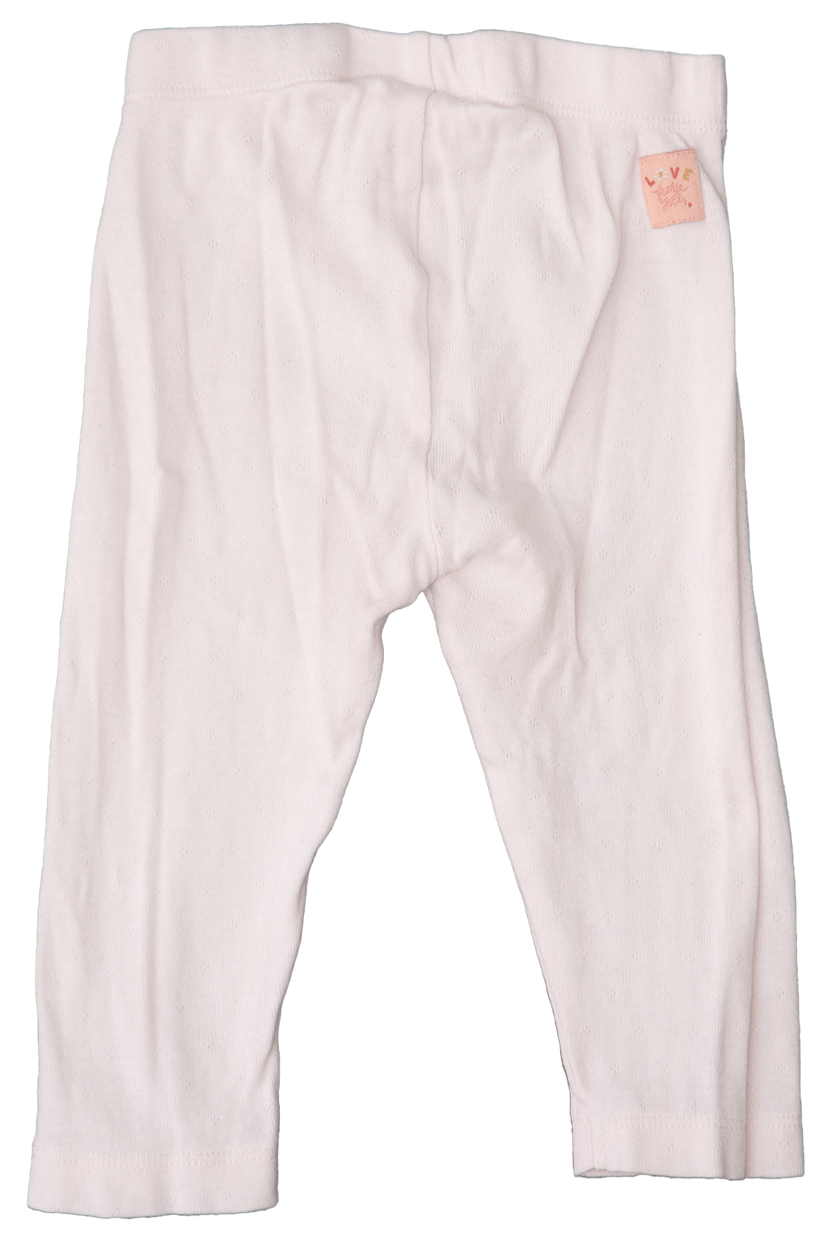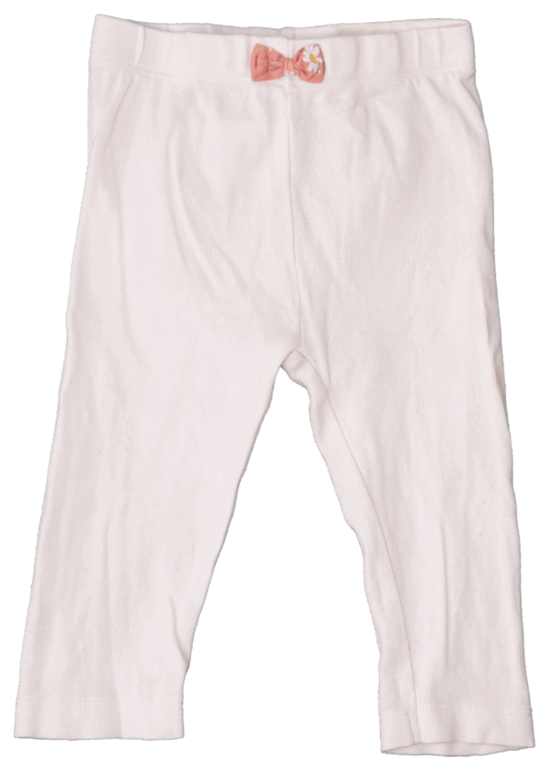 Feetje broekje in maat 86 voor meisjes. Witte kleur met subtiel motiefje, roze strikje en elastische taille. Zachte biokatoen, in nette gedragen staat.