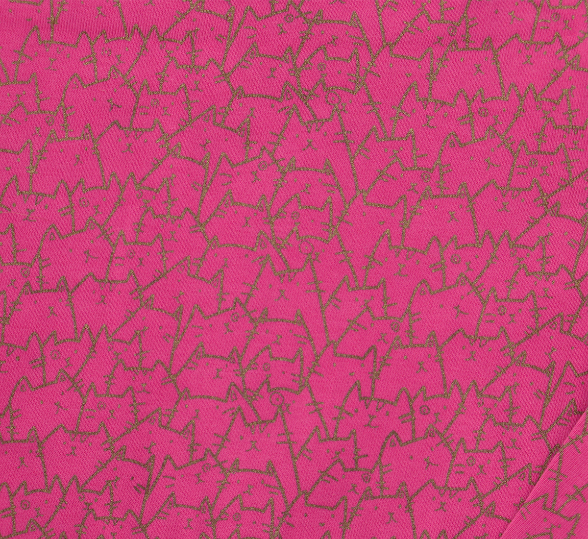 Wat meteen opvalt is de knalroze kleur van deze longsleeve. Lekker opvallend, vrolijk en superhip! De stof is versierd met een goudkleurig kattenmotief all-over. Subtiel glinsterend en perfect voor kleine dierenliefhebbers die houden van een beetje glamour.