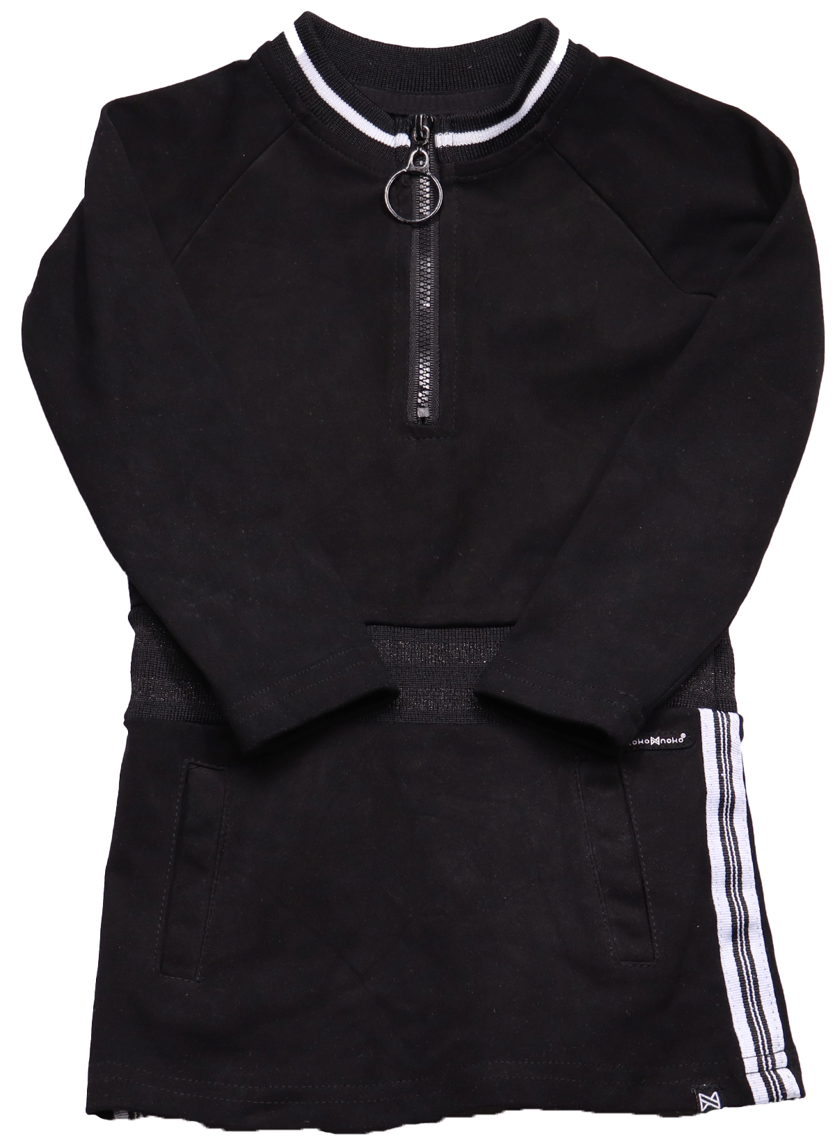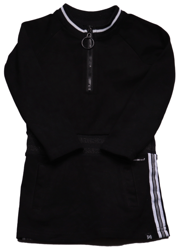 Deze sportieve jurk van Koko Noko in maat 86 is een stijlvolle keuze voor meiden die van comfort en functionaliteit houden. De jurk heeft een aansluitende fit en is recht van model, wat zorgt voor een moderne uitstraling. De halslijn is rond en voorzien van een klein opstaand kraagje, wat de jurk een sportieve en chique touch geeft. De ritssluiting aan de achterkant mist onderin een klein tandje, maar de functie van de rits is nog in orde.