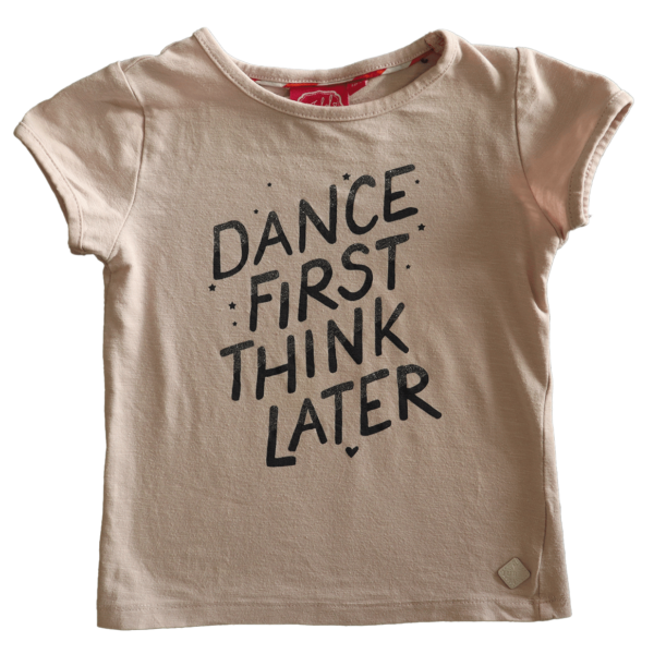 Wat dit T-shirt echt onderscheidt, is de gedrukte tekst op de voorzijde: ‘Dance first, Think later’. Deze speelse en inspirerende boodschap moedigt kinderen aan om hun creativiteit en spontaniteit te omarmen. Het is een herinnering om plezier te hebben, te dansen en te genieten van het moment, voordat ze zich zorgen maken over de details.