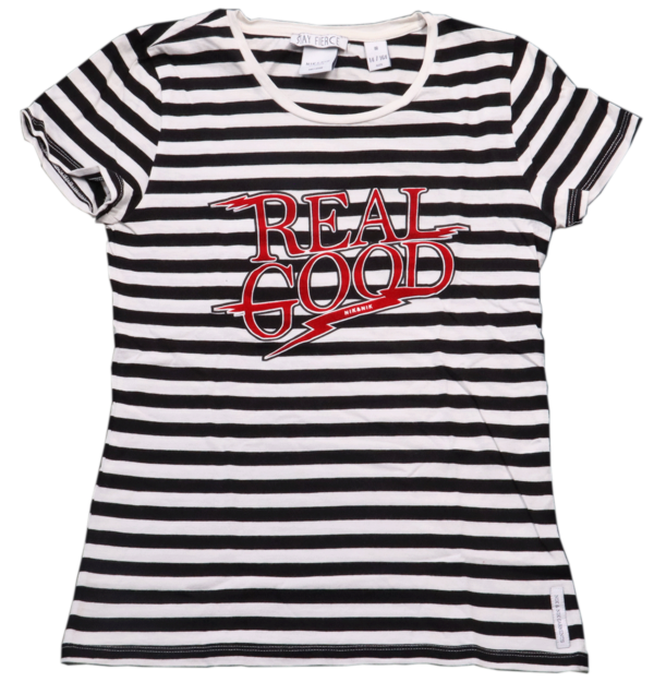 Het T-shirt is versierd met een zwart-wit horizontaal strepenmotief, wat het een tijdloze en stijlvolle uitstraling geeft. Op de voorzijde van het T-shirt staat in sierlijke letters de tekst ‘Real Good’. De letters hebben een rode kleur en voelen zacht aan, wat een leuk detail is. Dit T-shirt is gemaakt van 100% katoen, wat zorgt voor een comfortabele en ademende pasvorm.