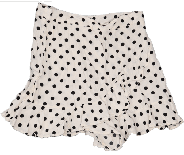 Deze leuke Zara short in maat M heeft een regular fit, hoge taille en een overslag met ruches. Gemaakt van witte viscose met zwarte stippen. De ruches en snit geven het de look van een rokje. Luchtig en stijlvol, perfect voor warme dagen. In goede staat, zonder vlekken of gaten.